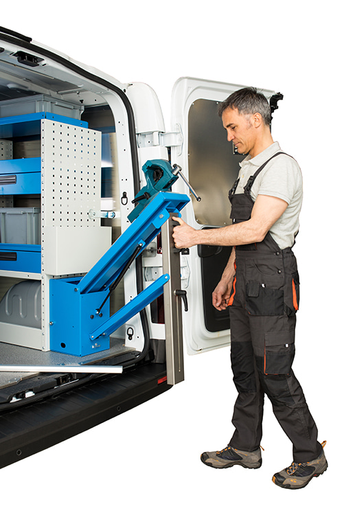 The two models of folding vice holders are mounted directly onto the side of a cabinet inside the van, near a side or rear door. Made entirely of metal, they are easy to open thanks to an external handle. The movement is assisted by two gas springs and precision-turned metal pins. The PM4 folding support is particularly suitable for smaller vans, as—unlike the larger PM3 model—it doesn’t require an extendable leg for ground support.