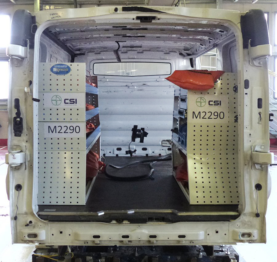 This test was performed at TÜV’s offices in Cologne, Germany. A van fitted with 135 kg of Syncro racking and accessories and loaded with 270 kg of tools and materials was driven into a rigid barrier at a speed of around 50 km/h. The test accurately simulated a typical head-on collision in order to assess its effects. TUV’s experts were able to see that, while the racking was subject to some deformation, it retained its cargo safely and therefore presented no risk to the van’s driver or passengers.